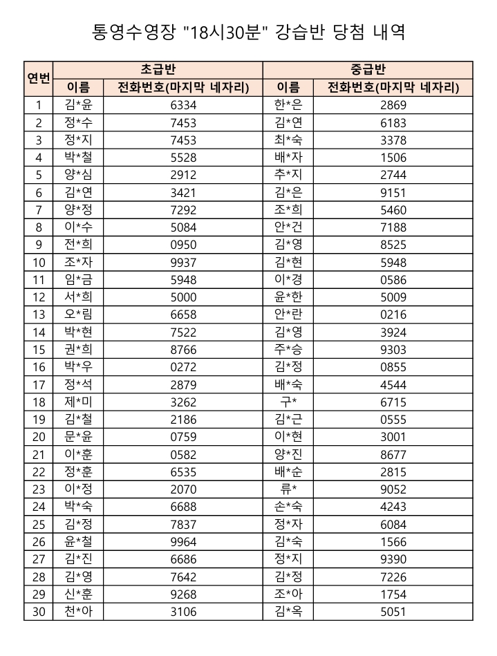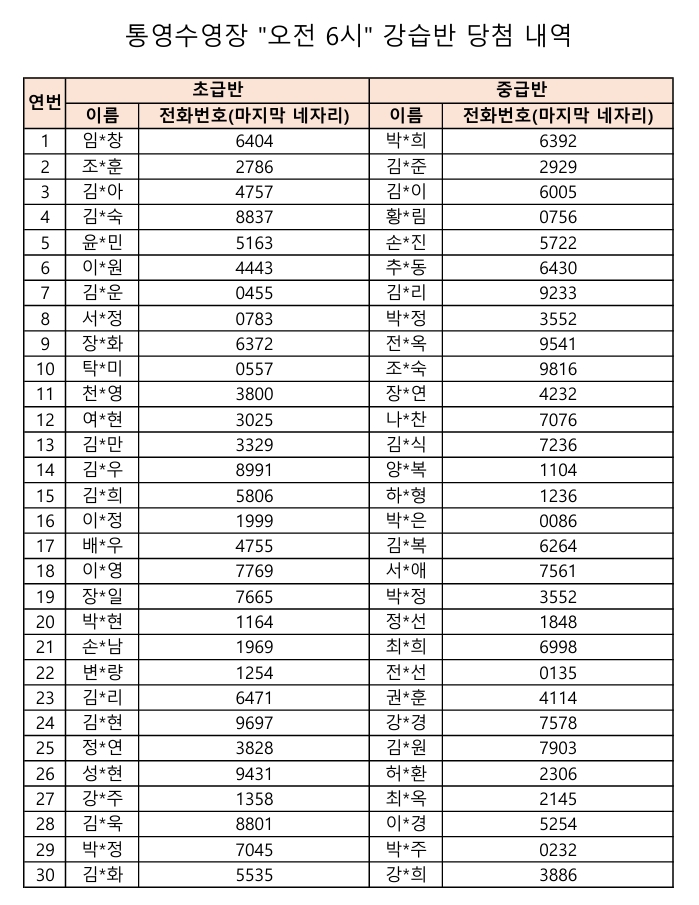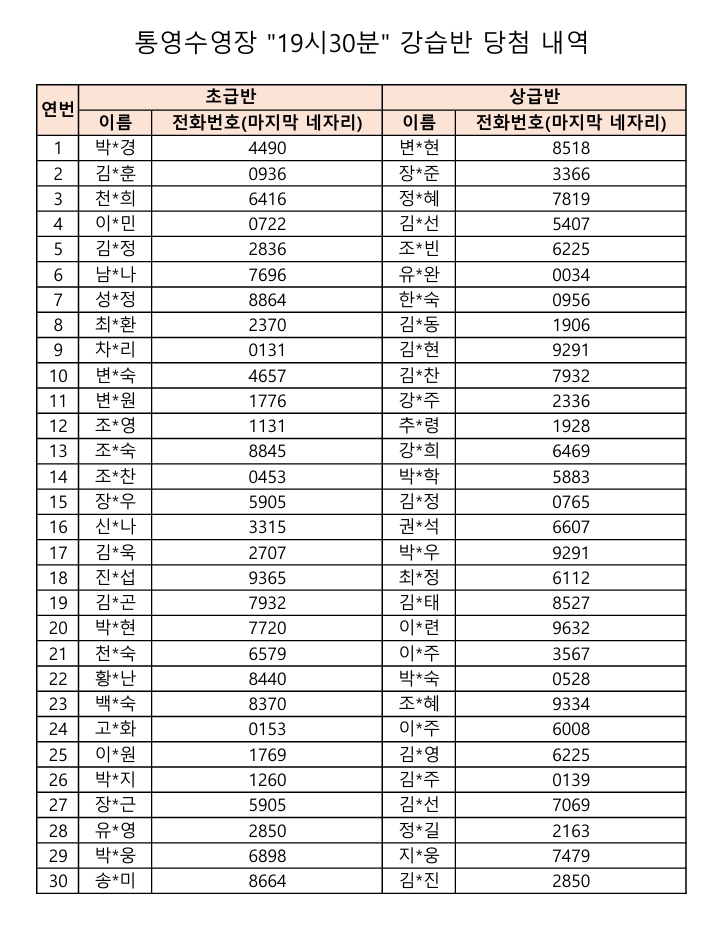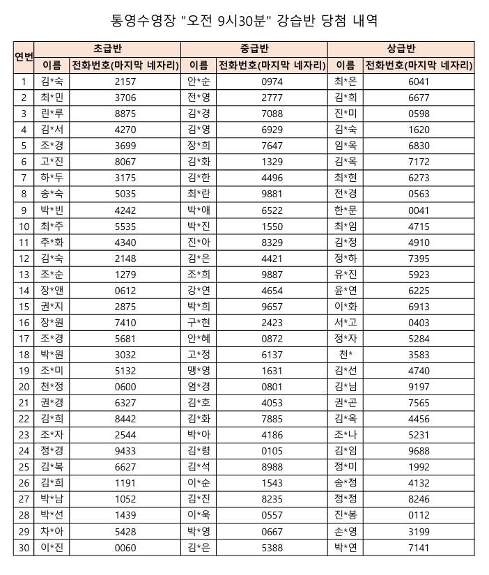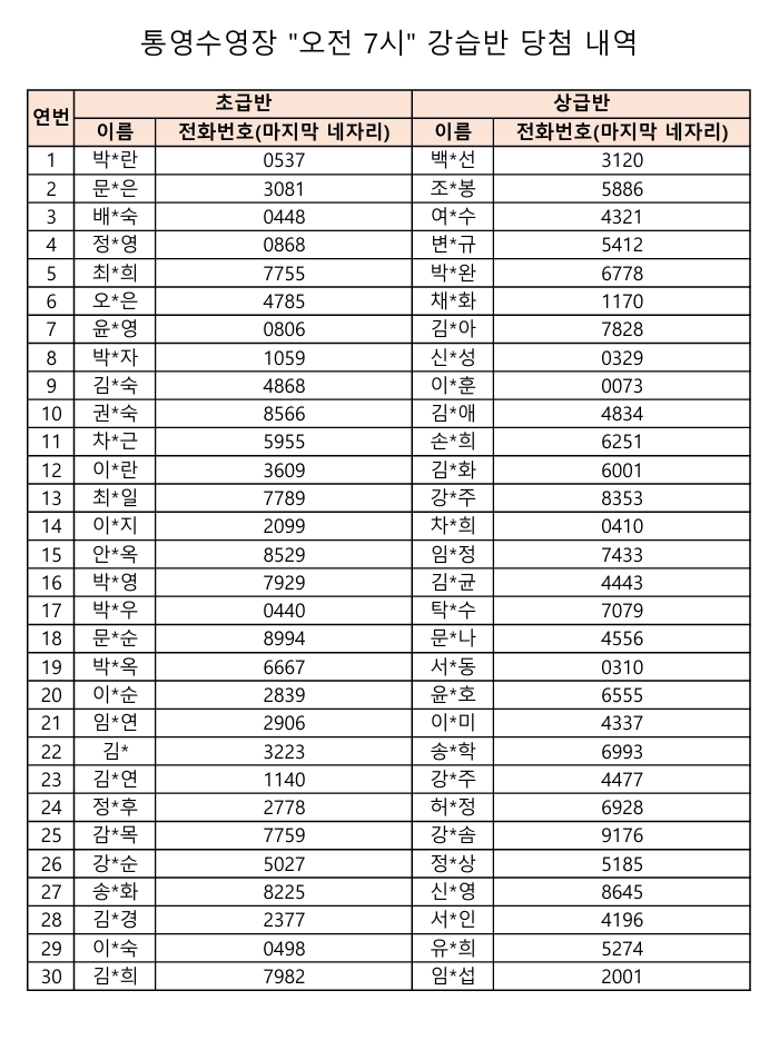 통영수영장 제2차 수영강습 추첨결과입니다.